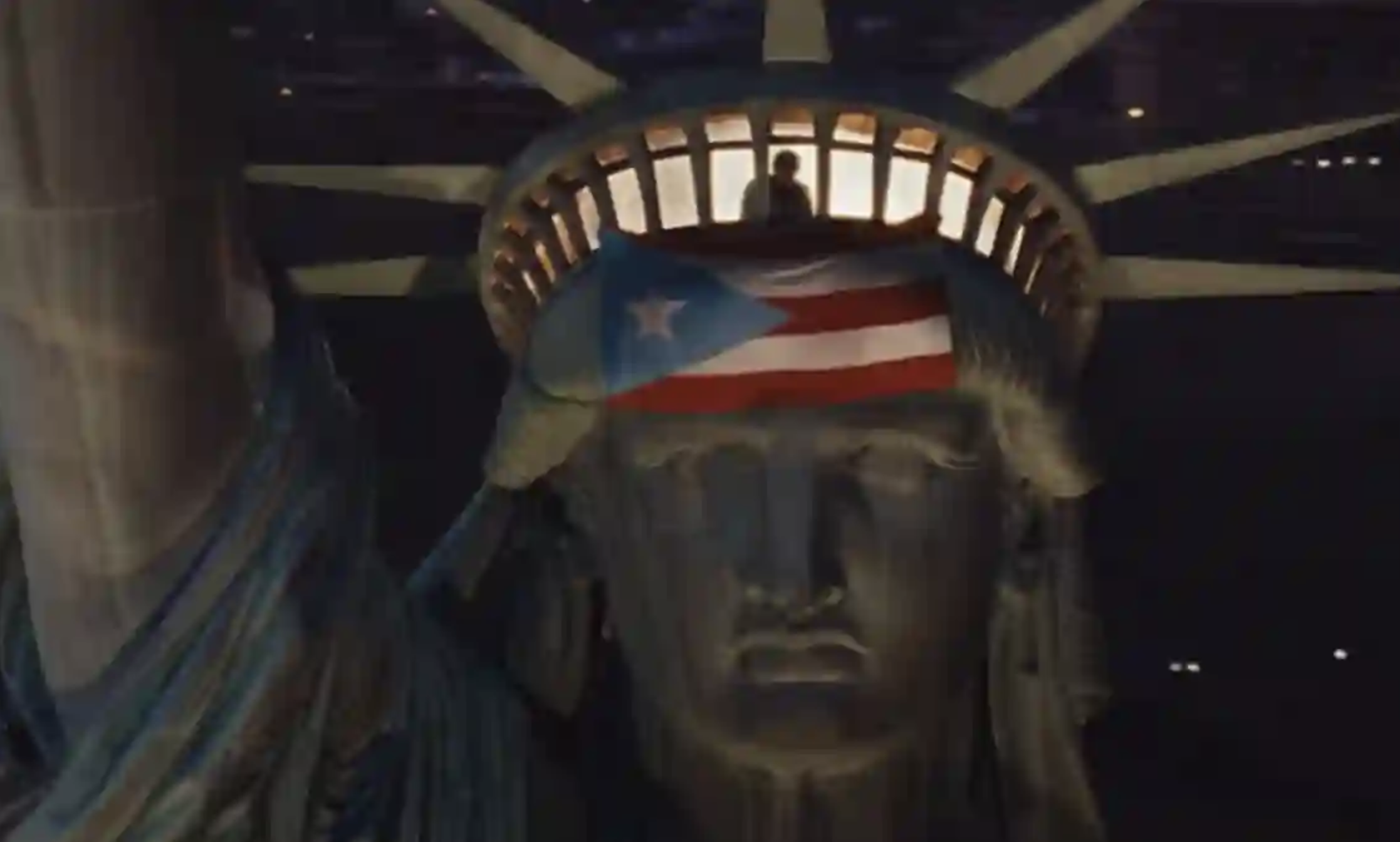 Entre las imágenes destacan una celebración de quinceañero, juegos de dominó y tradiciones culturales de Puerto Rico. También aparece la estatua de la libertad con la bandera puertorriqueña, haciendo referencia al debate político sobre el estatus de la isla.